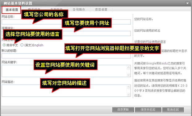 基本設置主要是填寫網站名稱連接地址網站主語言默認的標題網站關鍵字網站描述,填寫完后記得點擊“保存更新”。