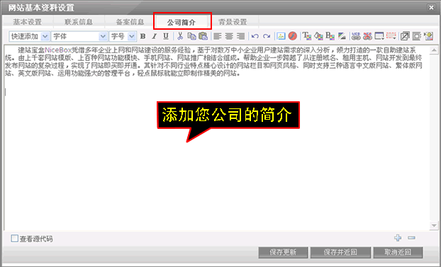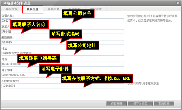 聯系信息主要填寫公司名稱聯系人郵政編碼地址電話電子郵件線聯系方式,填寫完后記得點擊保存更新。