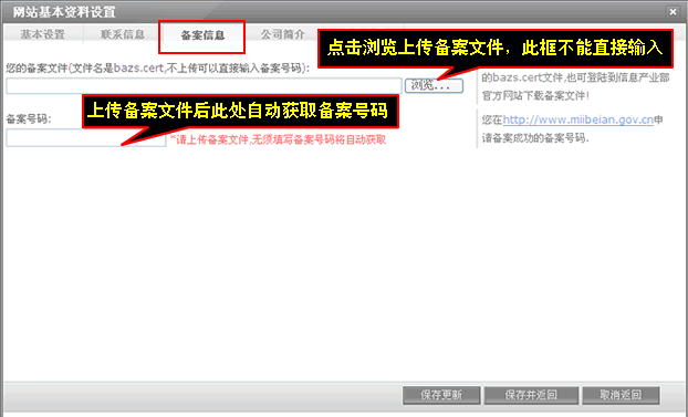 這里主要是上傳備案文件(備案文件要登陸到www.miibeian.gov.cn去下載),備案號碼在上傳好備案文件后自動獲取,無需填寫,填寫完后記得點擊“保存更新”。