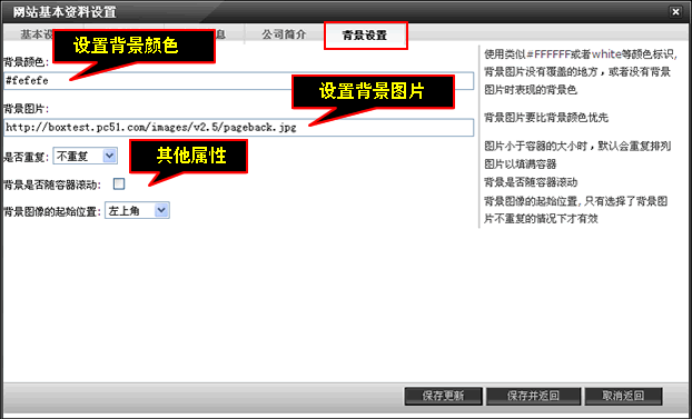 背景圖片:直接輸入背景地址就可以顯示出背景圖片:例如輸入http://boxtest.pc51.com/images/v2.5/pageback.jpg ,可以設置圖片是否重復、滾動以及起始位置。