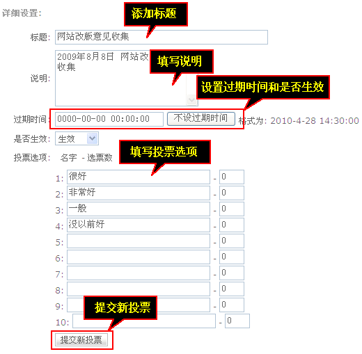點擊“增加投票項目”,彈出詳細設置,需要填寫標題說明設置過期時間是否生效,還有填寫投票選項名字選票數,最后點擊“提交新投票”。