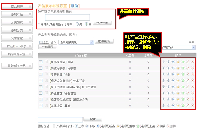 2、設置“郵件通知”,產品管理操作可對產品進行移動、推薦、上架、編輯、刪除等操作。