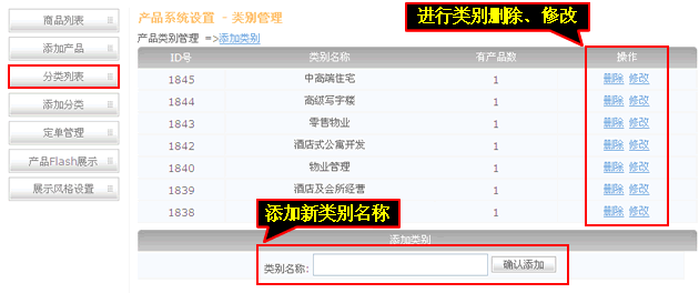 4、分類產品,可以添加、修改、刪除產品分類