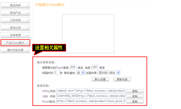 6、產品FLASH屬性可以設置產品展示FLASH效果