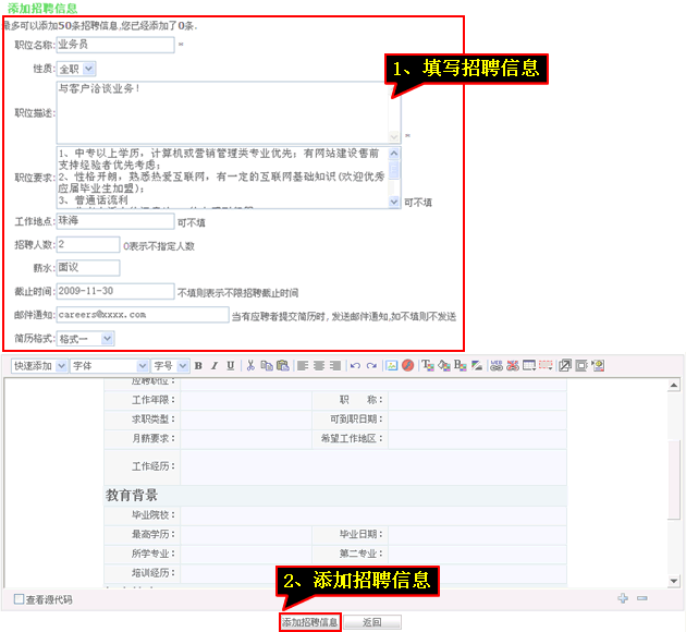 4、填寫“招聘信息”后點擊“添加招聘信息