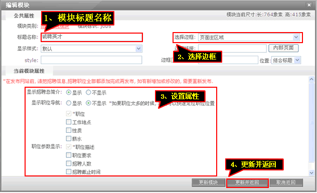 7、輸入模塊標題”設置“相關屬性”后點擊“更新并返回