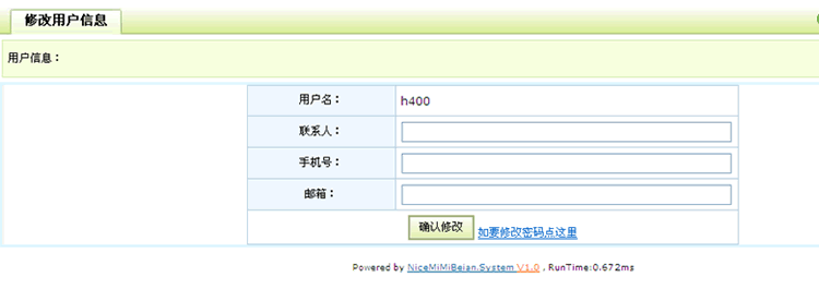 修改用戶信息:進入該界面可以修改用戶聯系人,手機號碼和郵箱等信息及修改用戶名的密碼