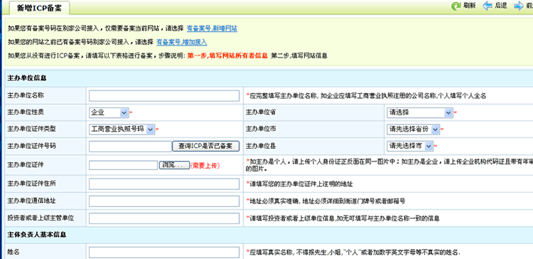 若果您從來沒有申請過網站備案,請選擇“新申請備案”,選擇之后進入后如下圖: