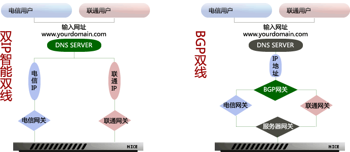 雙IP智能雙線需要設置兩個IP地址,最佳訪問路由是由域名DNS服務器根據(jù)訪問者的登陸IP來確定的。 相比雙IP智能解析,BGP雙線服務器在骨干路由決定最佳路由時,有可能由于網(wǎng)間路由跳轉次數(shù)比較多,訪問的速度比雙IP智能雙線慢一點;而雙IP智能雙線由于是軟件決定,有可能由于軟件數(shù)據(jù)庫不完整或者IP數(shù)據(jù)的變更造成的自動識別錯誤。 總之BGP雙線與雙IP智能雙線各有千秋,各有優(yōu)勢,在解決中國南北電信問題上都充當著重要的角色。 |
